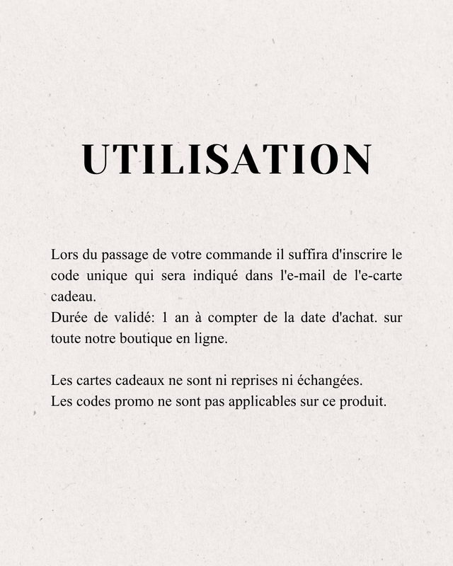 E-Carte cadeau utilisable en plusieurs fois et valable 1 an à compter de la date d'achat sur toute notre boutique en ligne https://1993atelier.com
